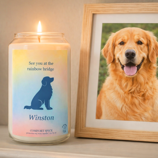 A personalized Rainbow Bridge candle to remember the dog who changed your life. The perfect dog sympathy gift.