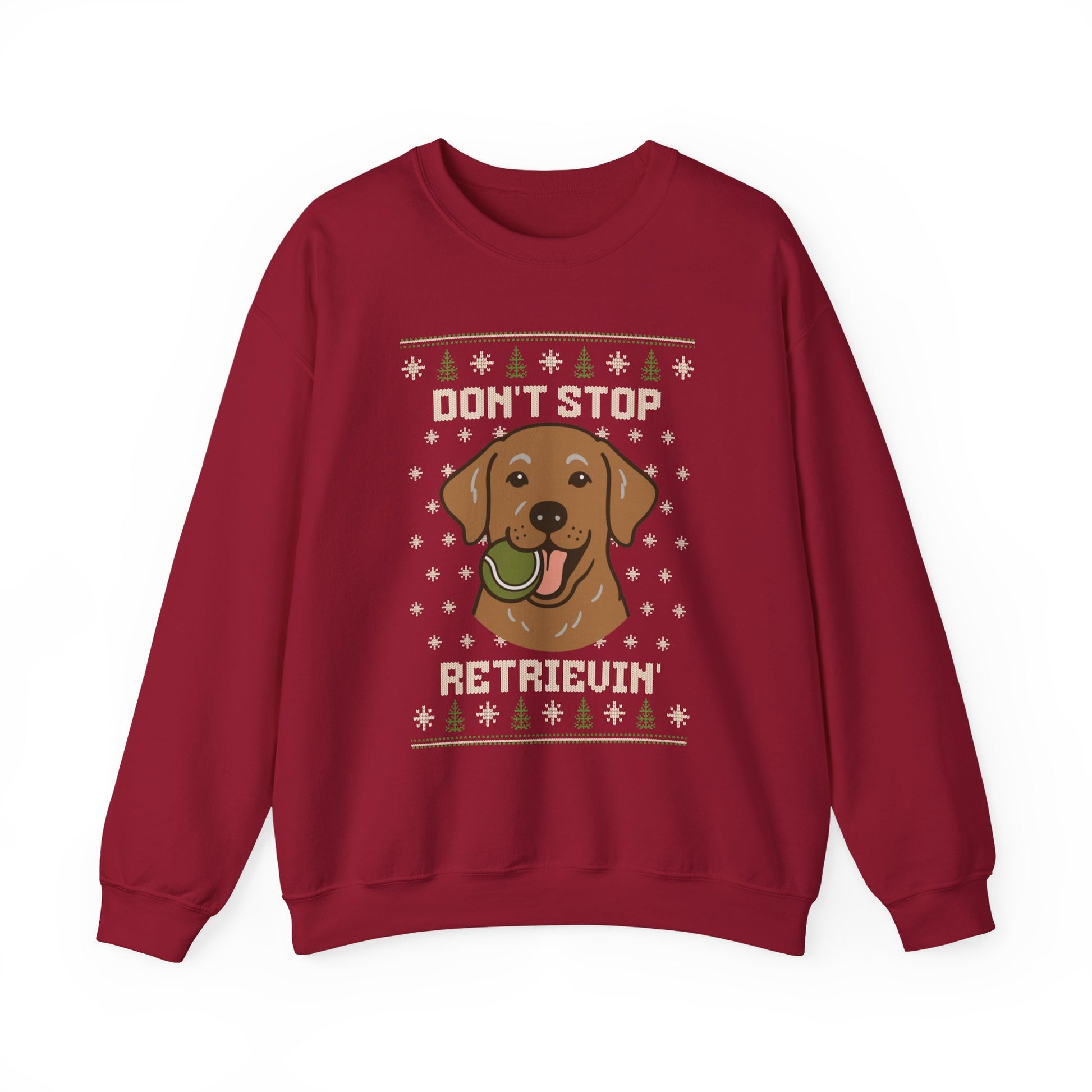 This Christmas sweatshirt features a design of a playful Chocolate Labrador Retriever holding a tennis ball in his mouth with the playful phrase "Don't Stop Retrievin'". Perfect for an ugly Christmas sweater party or as a gift for dog lovers near or far.