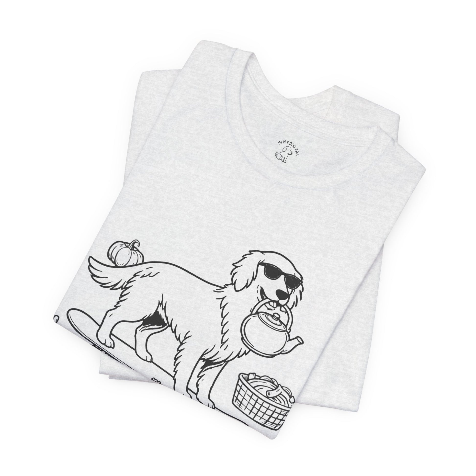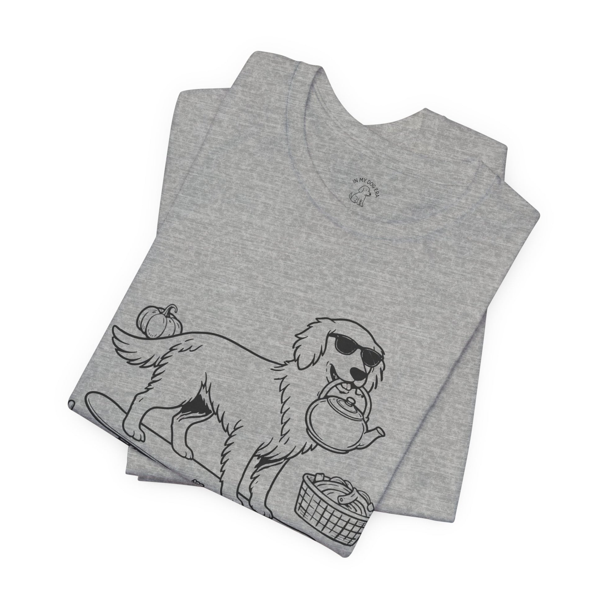 This tee features Duke cruising by his favorite stolen treasures, teapot in mouth, living his best chaotic-good life. Designed for dog people who appreciate a little mischief, a lot of personality, and the kind of dog who makes every day more fun.